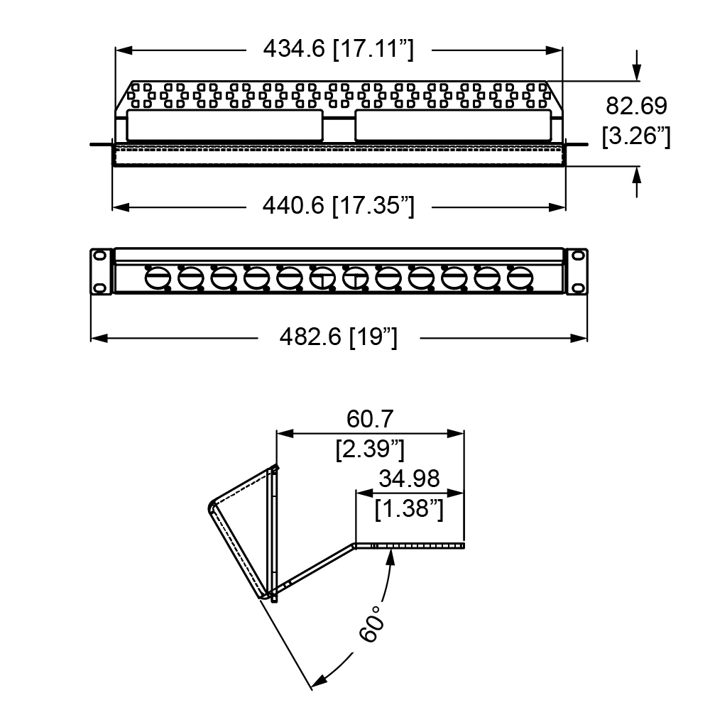 1U Reversible Tilted Rack Panel Punched for 8 x D-Series Connectors with Cable Management Lacing Bar