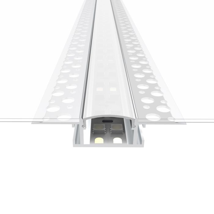 Wide plaster-in aluminium extrusion for recessing light strip into a plasterboard wall or ceiling.